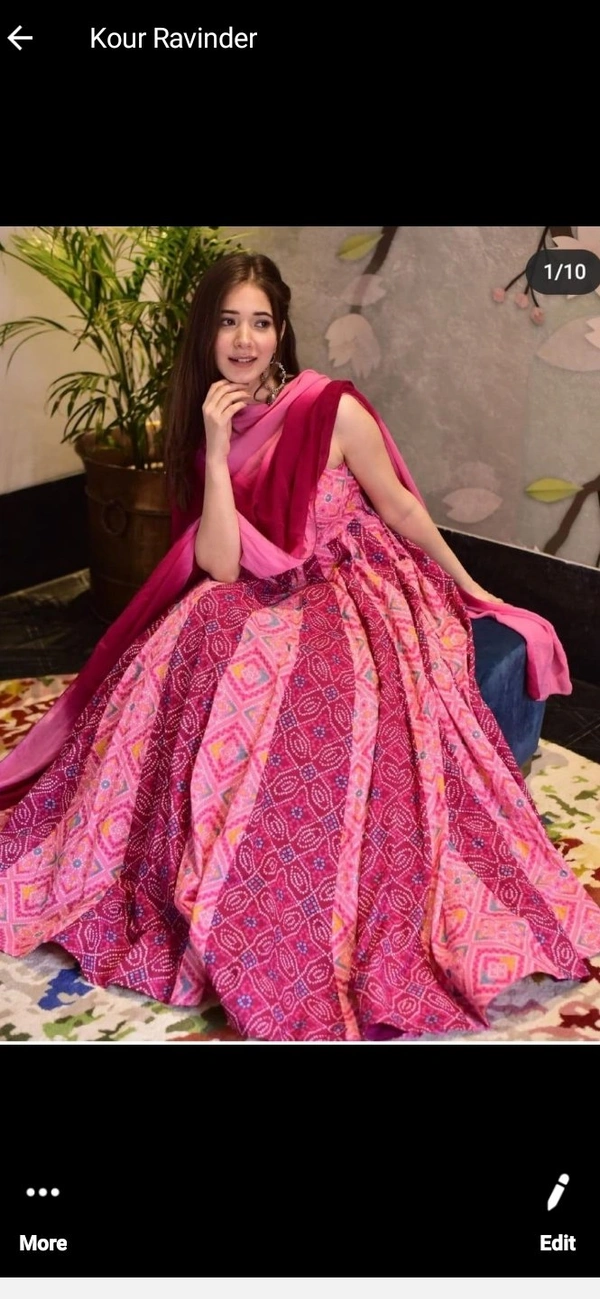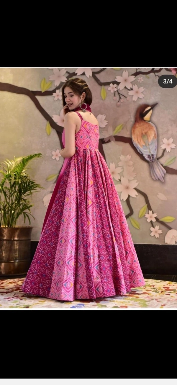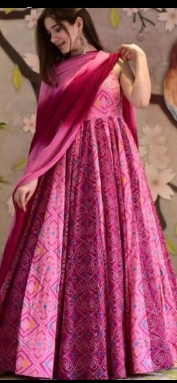 Printed butter silk gown with heavy georgette duppata inner:- silk gown length:-54 inch FULLY STITCHED GOWN (IN ALL SIZES AVAILABLE) sleveeless
